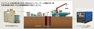 ・吸引排土方式の吸引機能の向上のために、エアーコンプレッサーの新設、バキューム装置の能力向上をはかったことにより、呼び径φ250mmで200m以上の連続推進にあたり、途中に仮設の中間発進到達立坑の新設工程が不要となるため、工程の短縮、経済性、施工性が向上する。