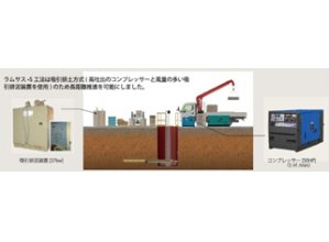 ・吸引排土方式の吸引機能の向上のために、エアーコンプレッサーの新設、バキューム装置の能力向上をはかったことにより、途中に仮設の中間発進到達立坑の新設が不要となるために、中間発進到達立坑の新設に伴う騒音を発生させないため、周辺環境への影響が低減する。