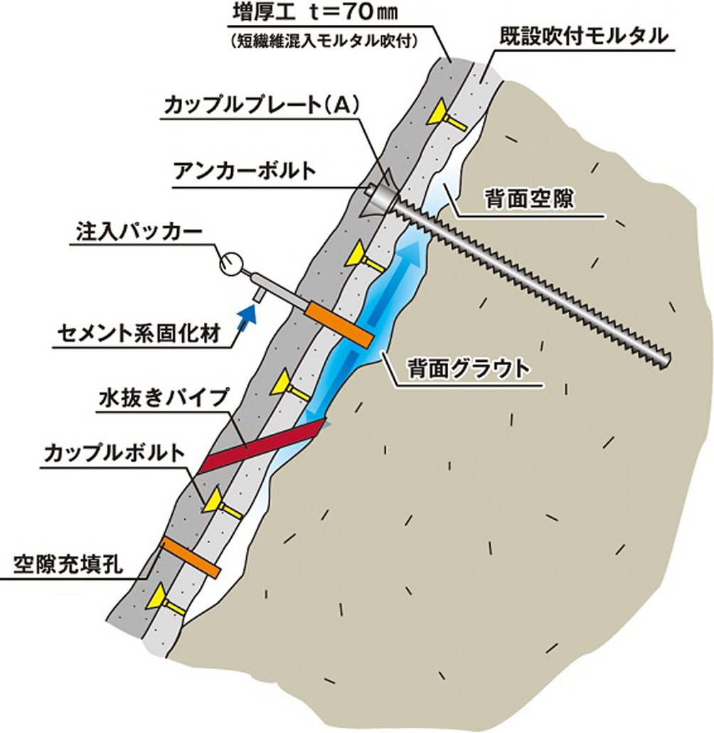 ・アンカーボルトで既設モルタルを確実に地山に固定できるため、安全性が増す。