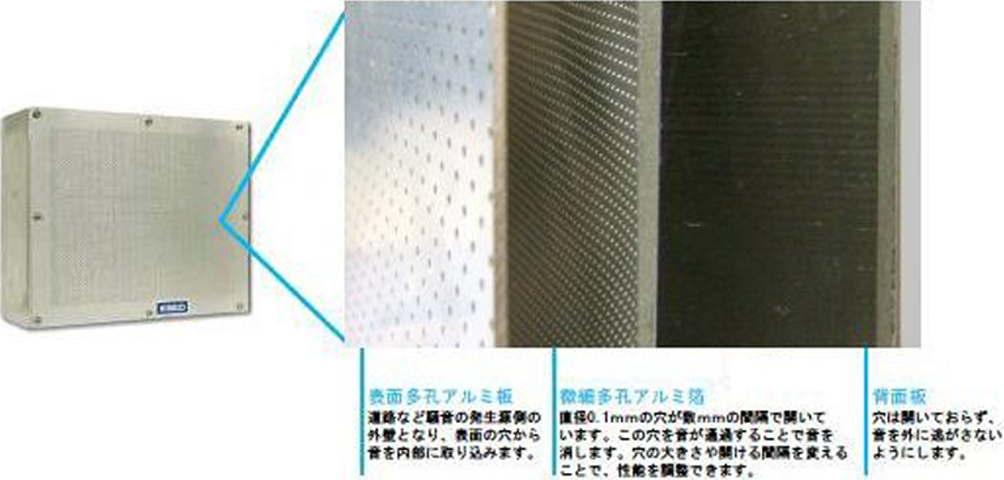 一般的に遮音壁は、騒音が直線的に拡散するのを阻止する「遮音部分」と、その内側に設けられ、直進する騒音の吸収や、壁または車体で反射された音が拡散するのを防止する"吸音部分"から構成されている。アルミ箔エコキューオンは、「吸音部分」に従来から多く使用されている繊維系吸音材ではなく、0.1mm程度の直径の孔を無数に空けた、厚さ0.1mmのアルミ箔(微細多孔アルミ箔)と、遮音用のアルミ板との間に適度な空気層を確保した構造(3層式、2層式)を採用しており、アルミ箔の枚数、孔径、開口率、及び空気層の厚みを変えることができる。
