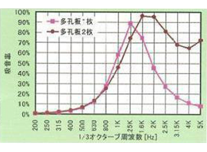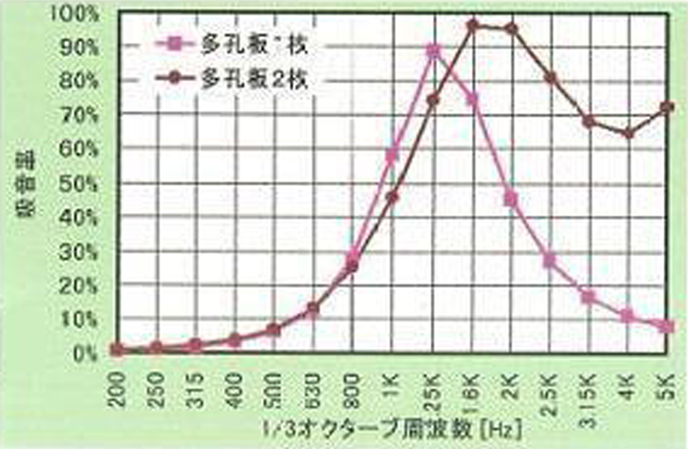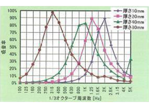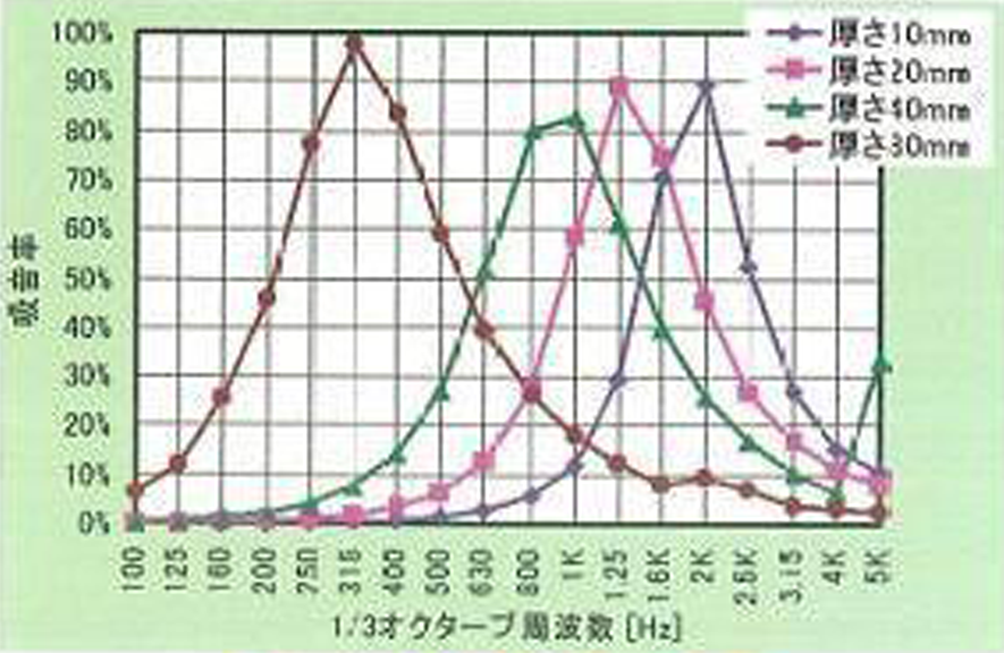 ・500Hz以上の周波数域で吸音率の低下がなく、幅広い周波数域で高い吸音性能を発揮する。