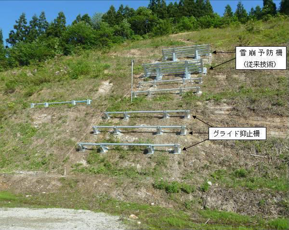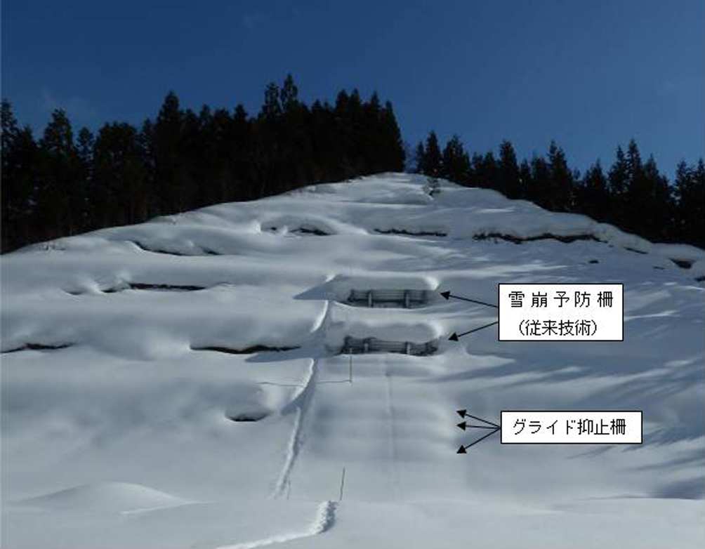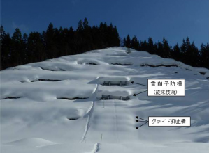 ・斜面積雪層の変形を抑制し、斜面上に滑らかな階段状の等厚さに近い形状で積雪されることから、除雪作業時の排雪置き場として活用可能である。