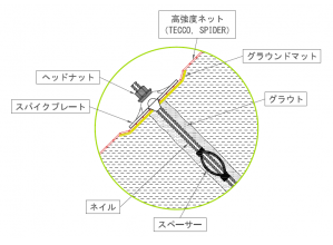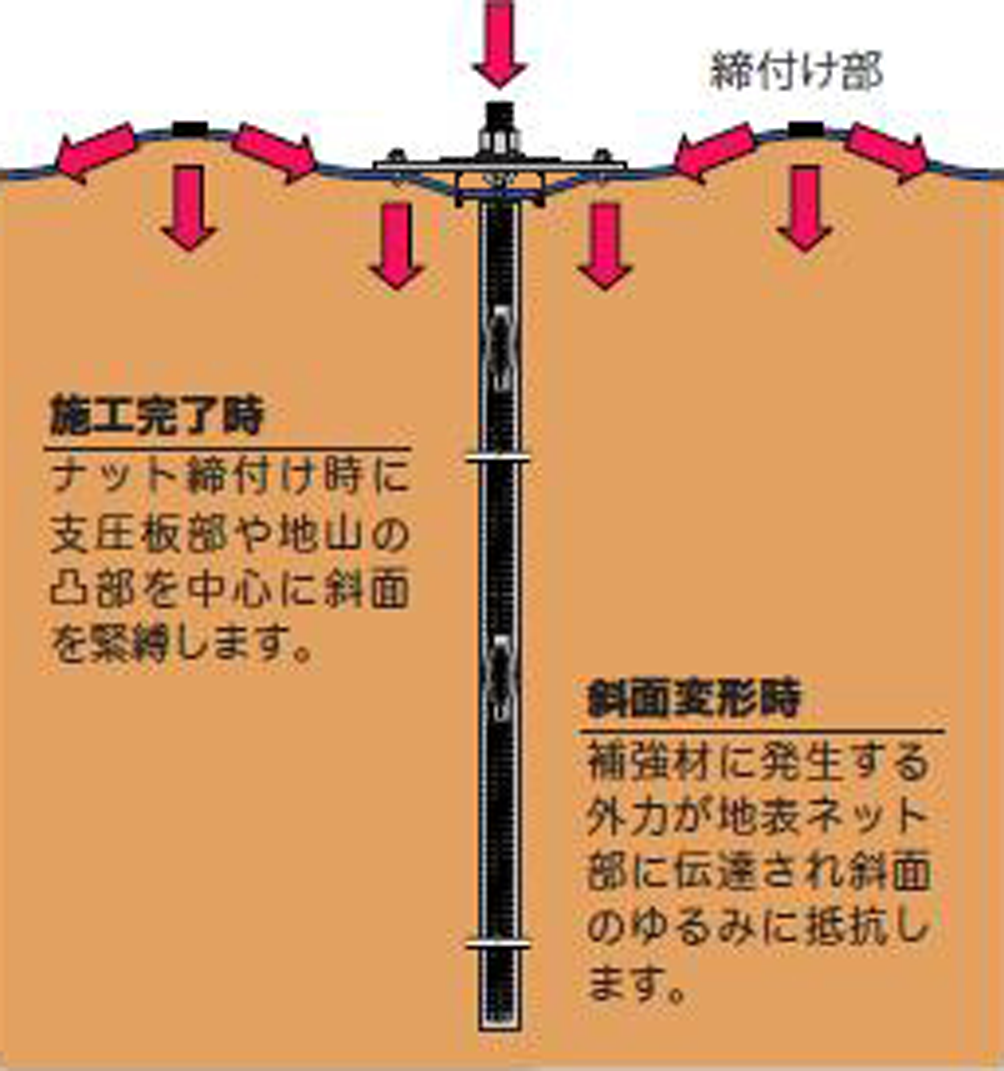・部材組立が簡易であり、法面工で一般的な工具を用いて施工できるため、(ロックボルトのナットを締めることにより、ケーブルに張力を導入することができる)、特別な技術を要する熟練工を必要としない。