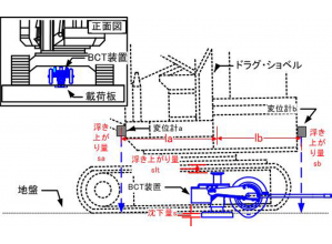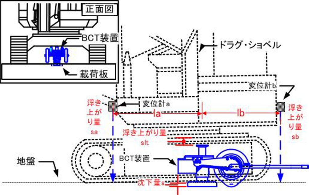 ・載荷板の沈下量の求め方を、基準梁と載荷板の相対変位によって直接的に計測する方法から、ドラグ・ショベルの浮き上がり量を前後に取り付けた変位計で自動計測して求め、この値をジャッキの伸張量から差し引いて求める方法(間接的に計測する方法)に変更した。