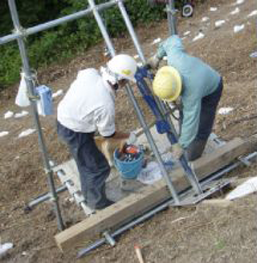 ・作業工程が簡便であり、1箇所あたりの施工時間が短いことから、省力化が図れ、熟練工を必要としないことから、生産性が向上し、工期を短縮することができる。また、部材も安価で、高価な専用機械や大型重機を使用しないので、施工費の縮減ができる。
