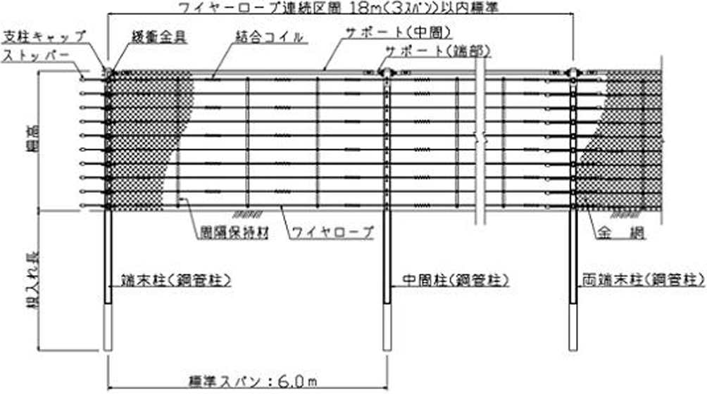 ・ワイヤロープに設置した緩衝金具により、落石エネルギーの吸収量が増大する。