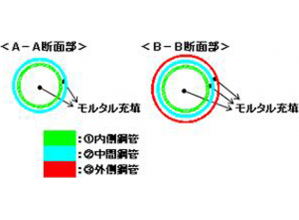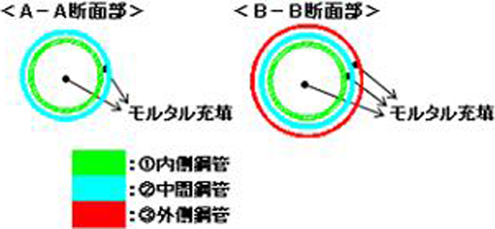 ・施工位置で独立した支柱を三重鋼管合成杭として組み立てる事により支柱耐力が向上する。