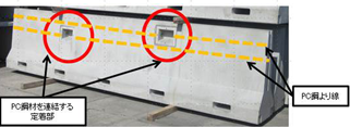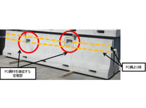 ・従来製品の施工手順は、製品を設置後に、目地部に無収縮モルタルを充填して、モルタルが硬化した後に、PC鋼より線で製品を緊張して一体化を図っていた。これを、製品を設置した後に、PC鋼より線で緊張した後に、目地部に無収縮モルタルを充填できるような構造に変更した。