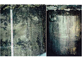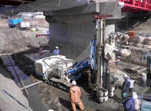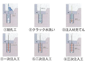 ・基礎杭を掘削して露出させることなく、フーチング上部から杭芯部にボーリング孔をあけ、基礎杭内部から補修材を注入し補修を行った。