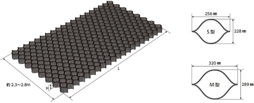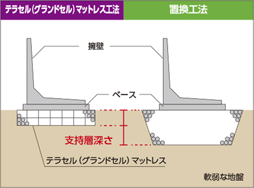 ・従来の砕石置換工法から、高密度ポリエチレン製からなるテラセル(グランドセル)を用いたこと。