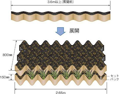 ・コンクリートブロック積工と比べると残土処理が削減でき、壁面緑化も可能である。