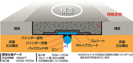 ・特殊合材とゴムシートによりスムーズに伸縮に対応することができ、ジョイント端部のクラックを低減できる。