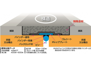 ・上部舗装部に付着性が強い特殊性合材を使用し、床板上にゴムシートを敷設することにより低温時に優れた伸縮性の特性を持つ。