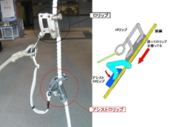 ・アシストロリップは、垂直親綱上を作業員の移動と共に付いてくる昇降用軽量ロリップを改良し、ロリップとロープで連結した構造である。そのため、親綱の弛みが少ない急斜面では、ロリップを上げると共に上がってくるので、操作性が非常に良い。