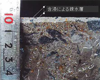 ・形成されたシリコーンポリマー保護層によって、コンクリート構造物の劣化因子である、水分、二酸化炭素、塩化物イオンの浸透を大幅に抑制する。
