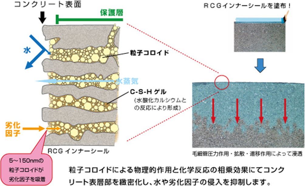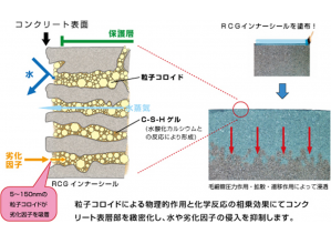 ・粒子コロイドの物理的作用と化学反応(C-S-Hゲルの生成)によりコンクリートを保護し、劣化因子(水、二酸化炭素、酸素、塩化物イオン)の侵入を抑制し、耐久性を向上させる。