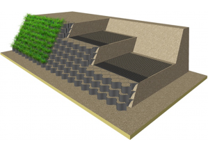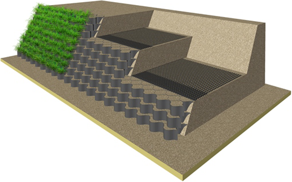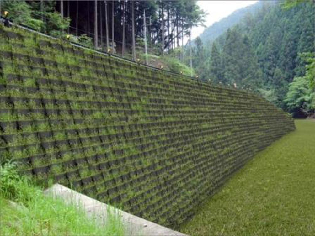 ・補強土工法に用いる壁面材を従来の鋼製枠に代えて樹脂製のジオセルとした。