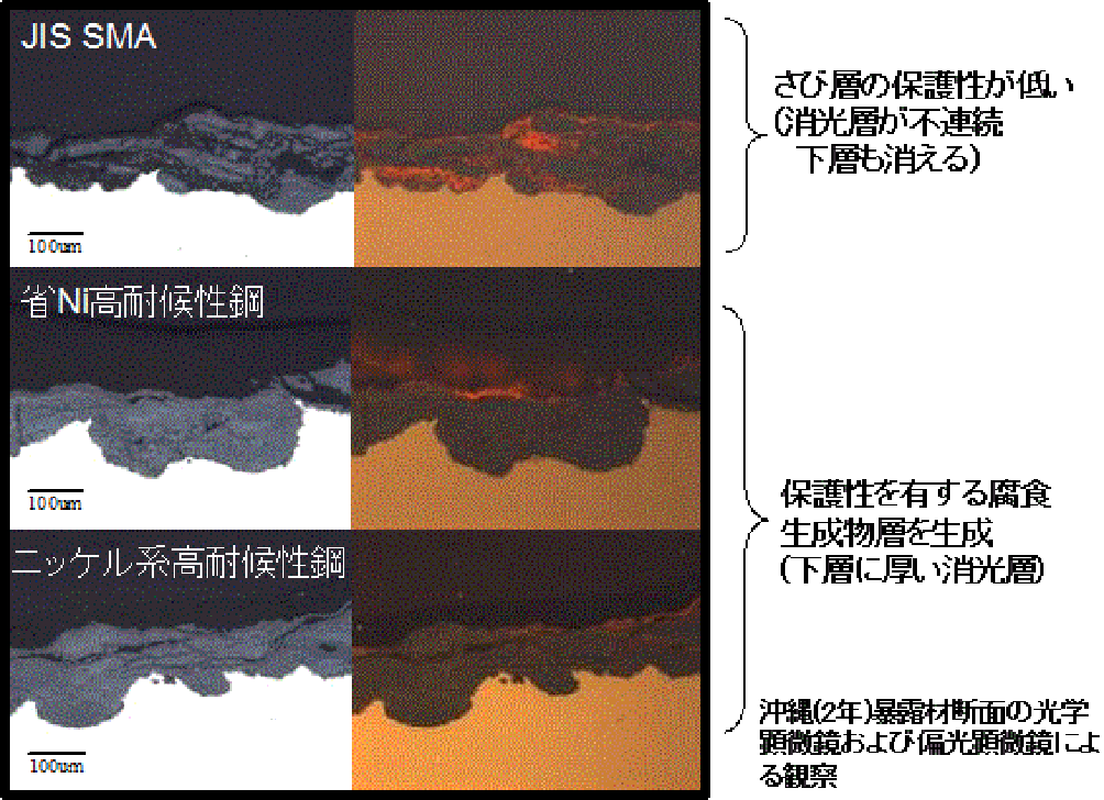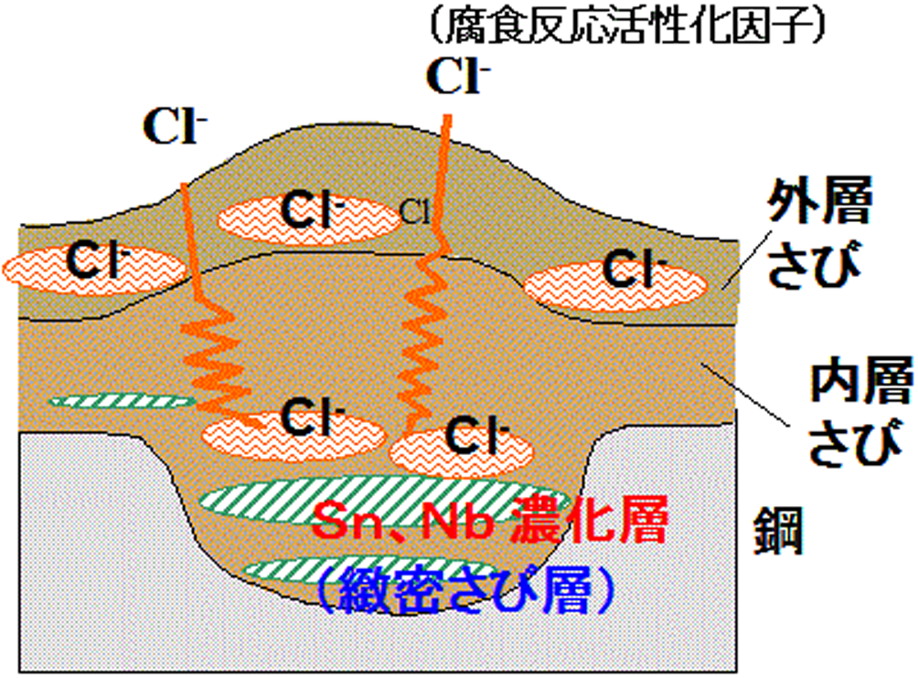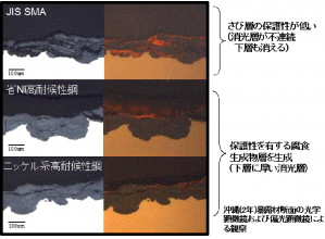 ・JIS SMに対して Ni、Cuなどが添加されたJIS SMAの成分を微調整した上で、さらにSn、Nbを微量添加することにより、緻密な保護性さびが最大0.3mddの環境においても形成される。そのため、最大0.3mdd以下の環境で無塗装で適用可能。