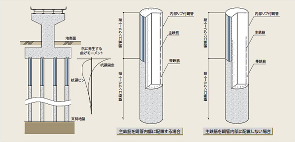 ・場所打ち杭の上部に、内面リブ付鋼管を用いて、鋼管とコンクリートを一体化したこと。