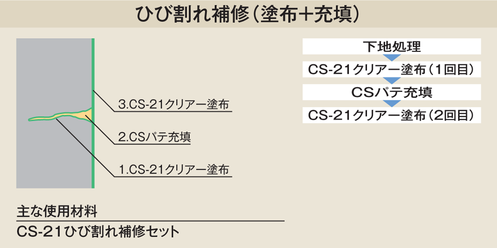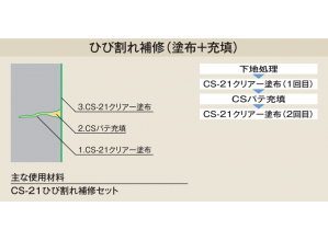 ・健全な部分の施工が不要となることと補修工程が少ないので施工時間が大幅に短縮できコストダウンができる。また、ひび割れは、CS-21クリアー塗布とCSパテ擦込みでひび割れ内部を緻密化し空隙が充填されることにより、コンクリート劣化因子の侵入を防ぎコンクリート構造物の耐久性を向上させる。
