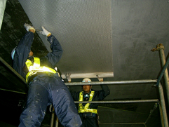 ・剥落防止の手段としては、軽量なビニロン製の連続繊維シートを採用し、樹脂で接着・固定することとした。