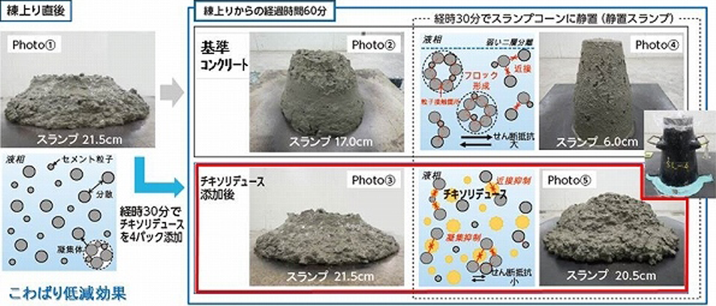・コンクリートのこわばりが低減し、流動性の保持性が向上することでスランプロスの低減となる。