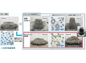 ・コンクリートのこわばりを低減し、コンクリートの流動性(スランプ・スランプフロー)の保持や材料分離抵抗性を向上するものである。