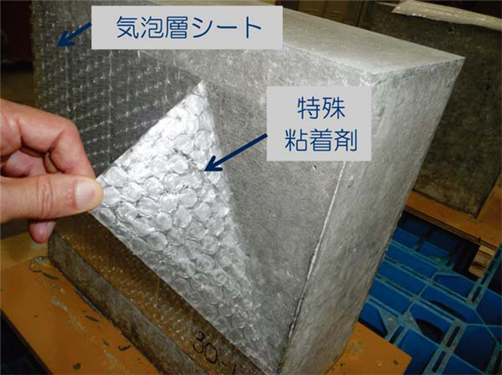 ・コンクリート表面にハイパーエアシートを特殊粘着剤で貼りつけることでコンクリート面に密着させ、封かん養生状態を実現した。