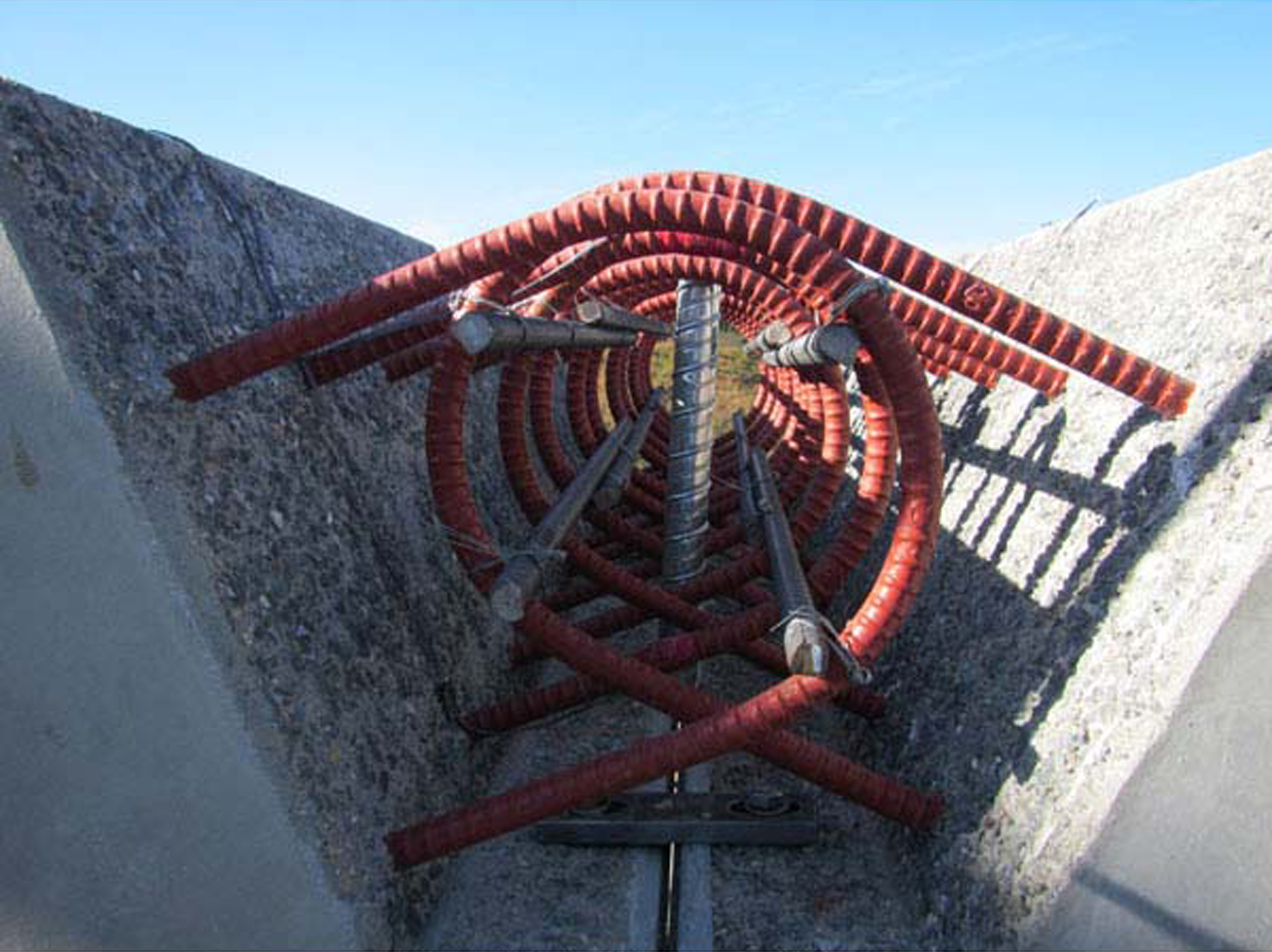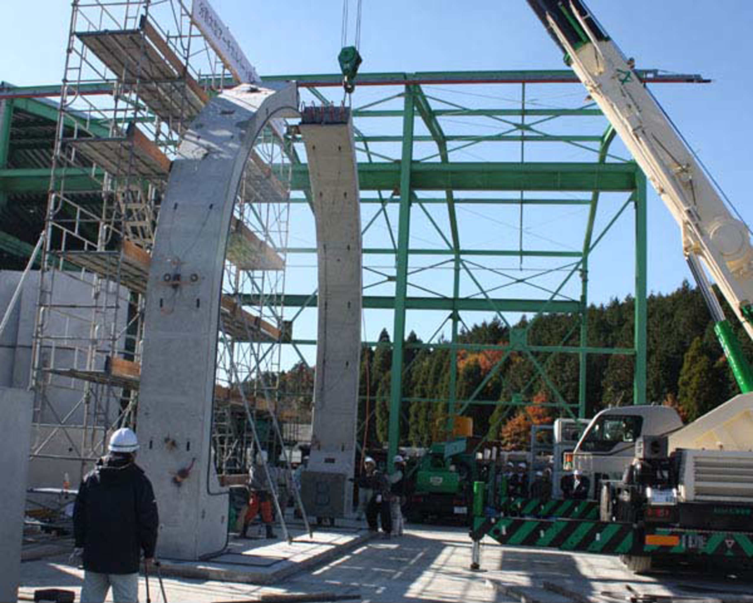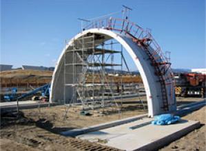 ・頂点接合部のループ継手構造による、2分割されたアーチカルバートのプレキャスト側壁部材と現場打ちコンクリートを併用した。