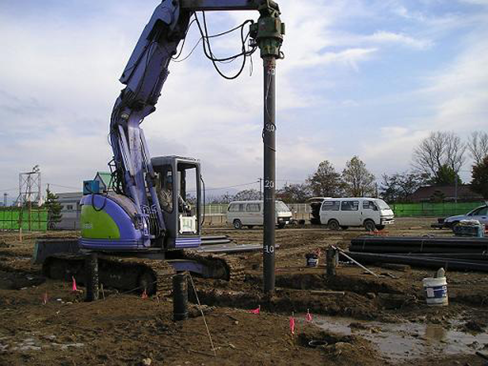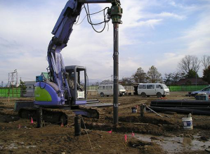 ・従来技術の中堀工法は大型重機を使用していた。新技術はバックホウに 油圧回転オーガモータを取り付け、回転力を鋼管杭へ伝える動力伝達装置として ヘクサチャックを 開発し 大型重機を不要とした。