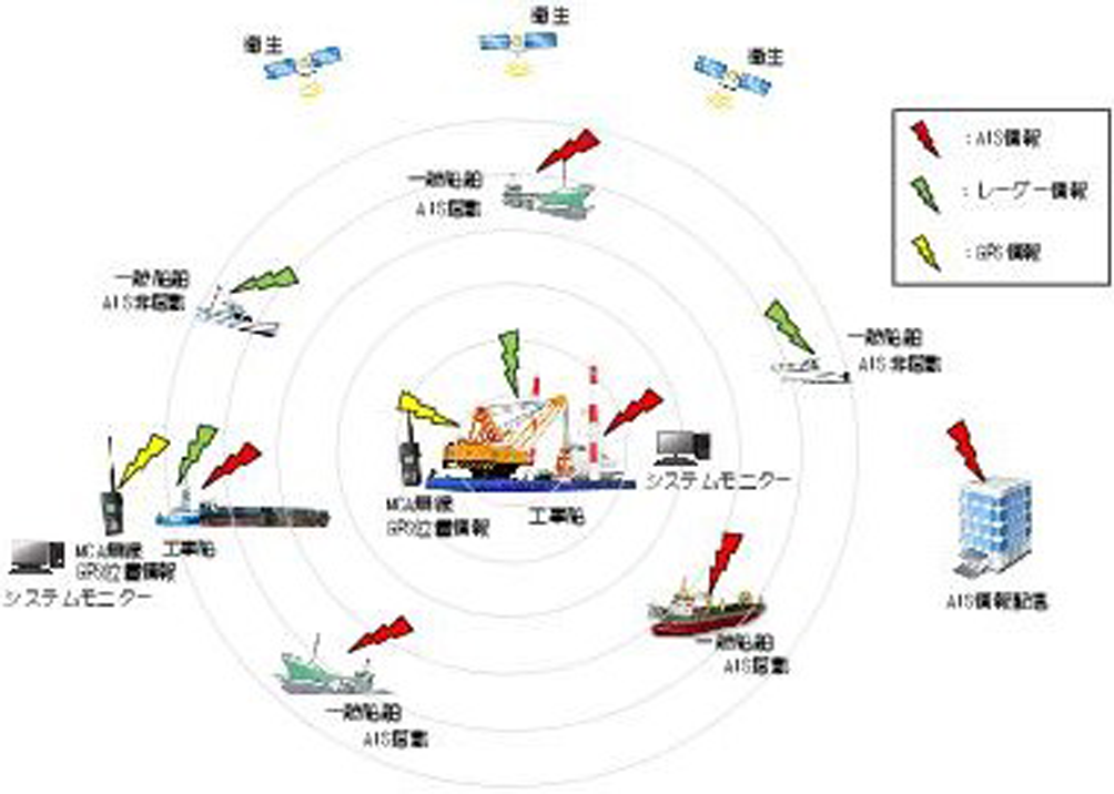 ・AIS情報、レーダー情報、MCA無線GPS位置情報(工事船)を同一モニターに表示、工事船と一般船舶との動静を一元管理し、全ての工事船が情報を共有できること。