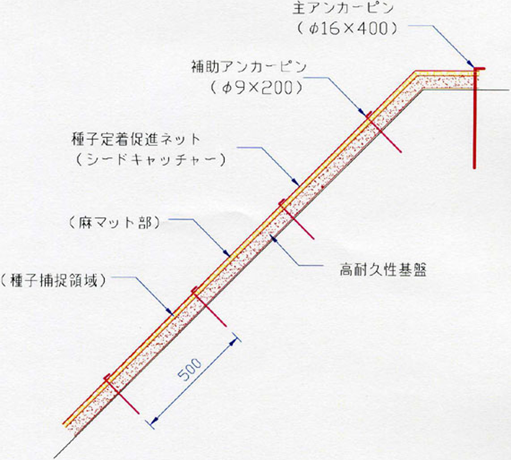 ・吹き付けた高耐久性基盤の上に、立体構造の種子定着促進ネット「シードキャッチャー」を張り付けることにより、風散布や重力散布される種子を効率よく捕捉して植生回復のスピードを速めることができる。