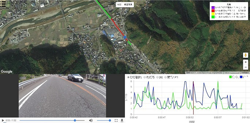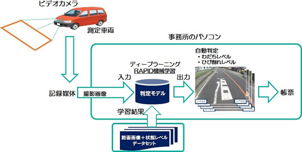 ・従来技術は、路面を撮影した画像からひび割れ・わだち掘れの損傷レベルを診断する場合、例示された損傷レベルのパターン写真と熟練者の経験に基づいて実施されていた。新技術は、従来の熟練者に代わりディープラーニングによりひび割れ・わだち掘れの損傷レベルを自動診断する方法に変えた。