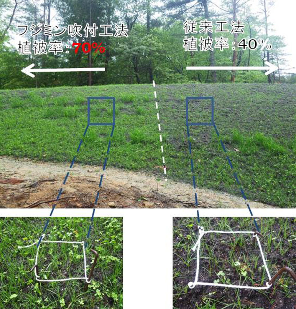 ・ネクストソイルに変えたことにより、ネクストソイルに配合されているフルボ酸による植物の生育促進効果が発揮され、早期に植物の根系緊縛力により法面保護機能を向上させることで,品質の向上が図れる。