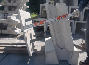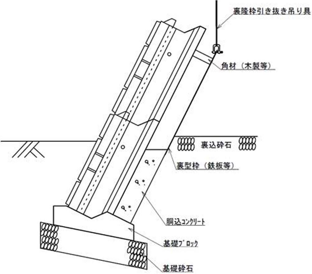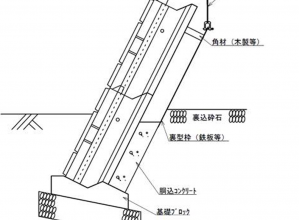 ・胴込コンクリートを打設のために、大型ブロックと、抜き型枠の距離の確保と固定するたの仮固定材(角材等)を、埋設できる鋼材にした。
