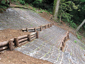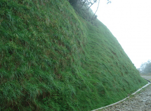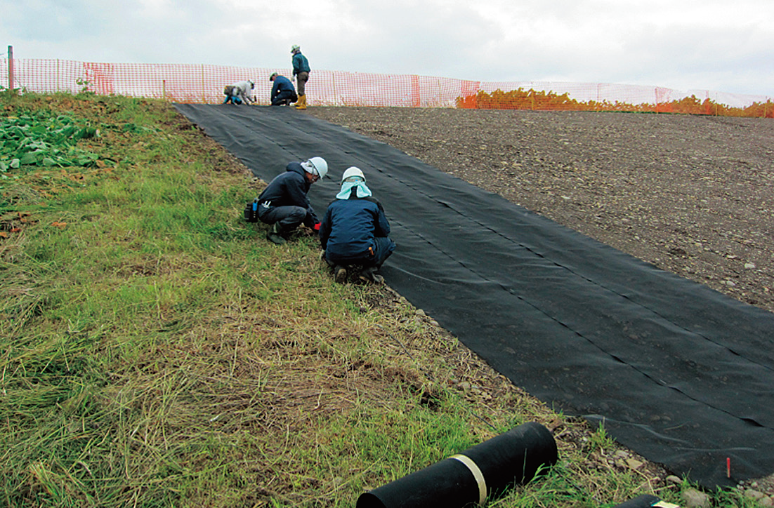 従来はイタドリ等の植生を抑制するものは何も敷設していなかったが、芝の下に樹脂製ネットを敷設して生育を抑制する手法に変更した。