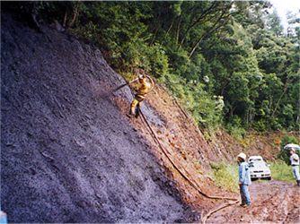 ・土砂のり面緑化、岩盤のり面緑化などに対して、同社指定の高品質な基盤材にのり面緑化吹付用安定剤「アルファグリーン」を組み合わせてのり面に吹付けて適正な植生基盤を造成