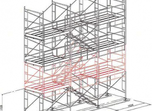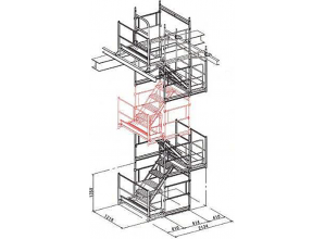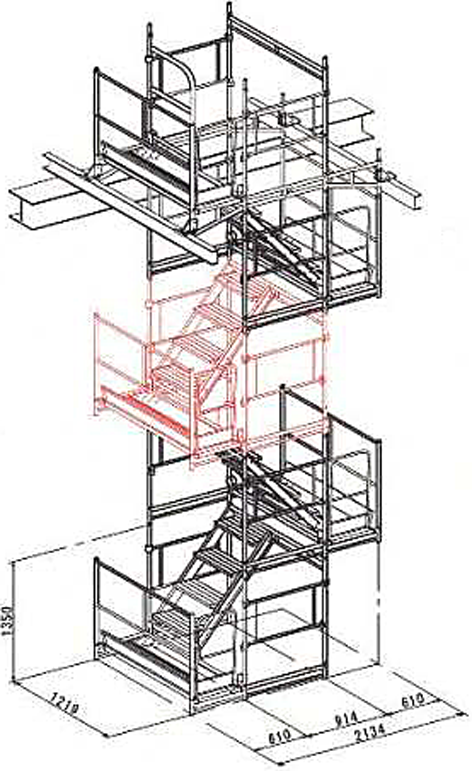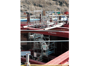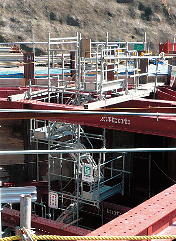 手摺先行型枠組足場の活用による組立自立型方式から、自立・吊り型ユニット式昇降階段システムに変えた。