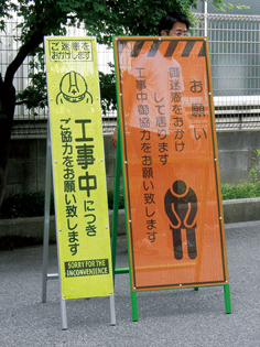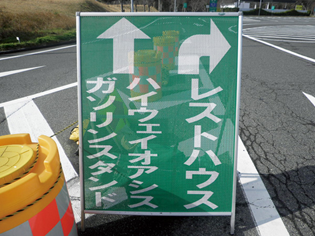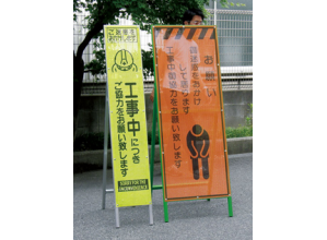 従来の標示板とは違い風を通す穴が開いているため、強風でも転倒しにくく看板後方の視認性も期待できる。