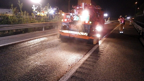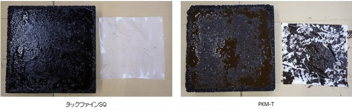 アスファルト乳剤のみの散布からアスファルト乳剤と分解剤の同時散布に変え、分解時間を短縮した。