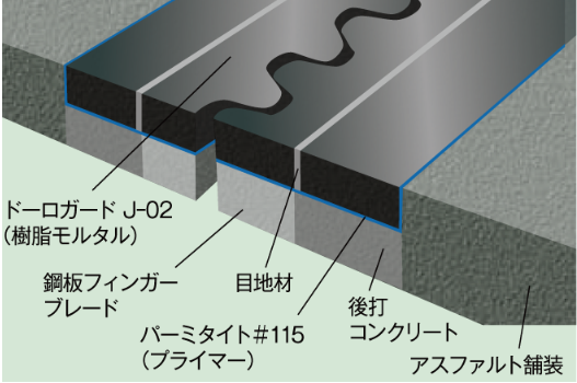 橋梁用伸縮継手装置において、脆弱化した床版クラック部の補修を兼ね備えた、埋設ジョイントである。