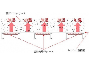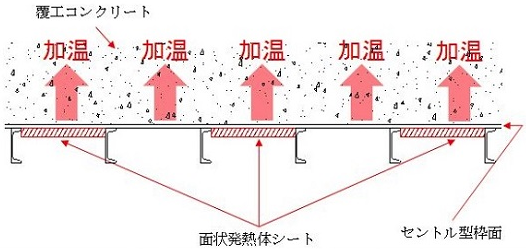 従来技術はジェットヒーターを使用し熱風でセントル内部を加温するが、申請技術は面状発熱体シートを使用しセントル型枠面を直接加温する方法に変更した。