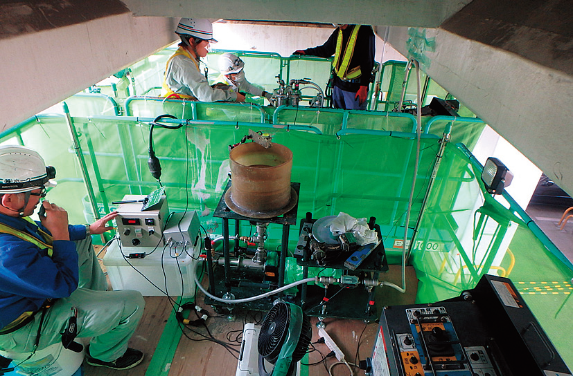 ・削孔径を15.5mに縮小したことにより、既設構造物に与えるダメージを軽減でき、かつコンクリートガラ処理量を大幅に縮減でき、注入準備工の施工性向上に繋がった。