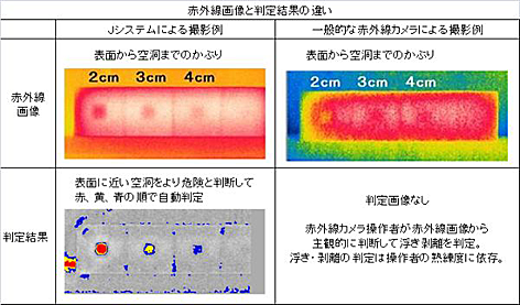 ・従来、コンクリートの浮き・剥離の検出は全面打音点検により対応していた。本技術は、高性能赤外線カメラによる撮影と、独自の赤外線画像解析技術により、遠望非接触にて高精度かつ定量的に浮き・剥離箇所を検出することが可能である。本技術を1次スクリーニングに用いることにより、打音点検面積の大幅な削減が可能となる。