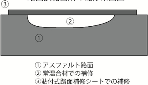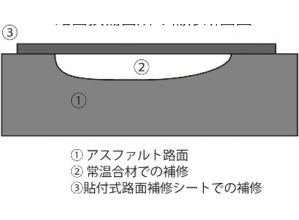 ・常温合材での路面補修箇所の保護のために、更に追加施工する強靱な貼付式補修シート。