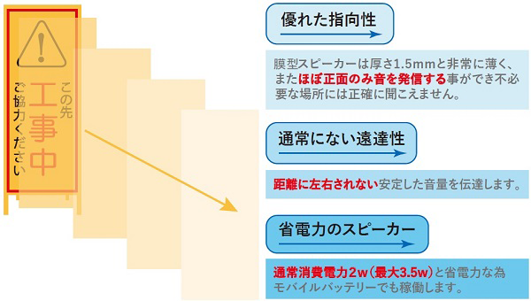 ・優れた遠達製を有する音声により、看板前面から30m程度離れた地点まで、大音量を発信することなく情報を提供できる。