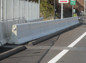 ・自動車が防護柵に衝突すると防護柵自体が移動することで、車の衝撃を緩衝させる構造とした仮設用防護柵。
