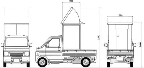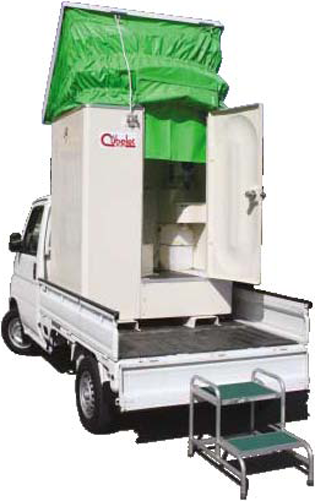 ・従来の定置式仮設トイレでは、運搬時に軽トラックの車両高さ制限(2.5m)を超えるため、普通又は大型トラックでの搬送しかできなかったが、トイレユニットの全高を低くして、軽トラックでの搬送及び積載したままでの使用が可能になった。