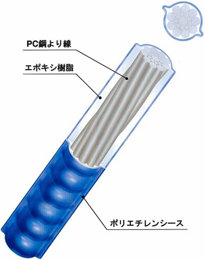 ・PC鋼材は工場出荷時に被覆されているため、現場保管時や配置後グラウトまでの期間に錆を生じる懸念はない。また、エポキシ樹脂硬化後は重防食鋼材として高い耐久性が確保される。
