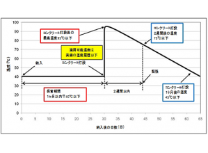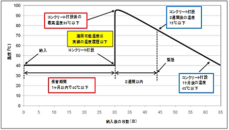 ・使用部位や季節などにあわせて、樹脂の使い分けや複雑な工程管理が不要で、実用上十分な長さの緊張可能期間が得られる。マスコンクリートのように、コンクリート打設後の温度が高温の状況でも実用上十分な緊張可能期間が得られる。